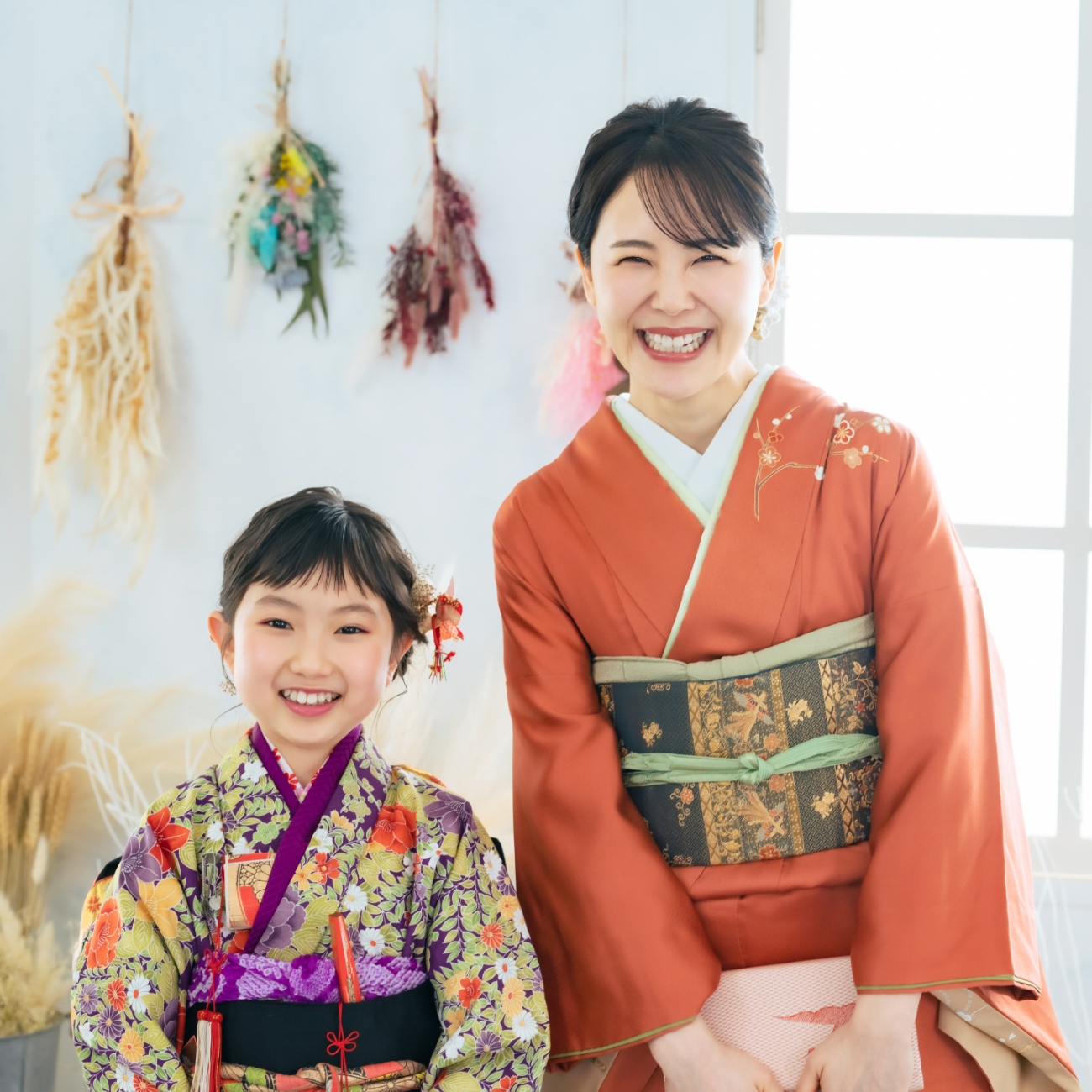 華やかな着物を身にまとった兄弟・姉妹の姿は、写真にさらなる美しさと豪華さを加えます。特に七五三の着物は色鮮やかで豪華なデザインが特徴で、家族写真として素晴らしい一枚となります。